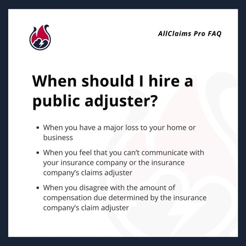 Allclaims Pro is fully licensed, bonded, and insured Public Adjusting firm. Our experts represent the policyholder when working with insurance claims. We ensure that the policyholder is compensated for everything owed following a loss, relieving them the burden and stress of the claims process.